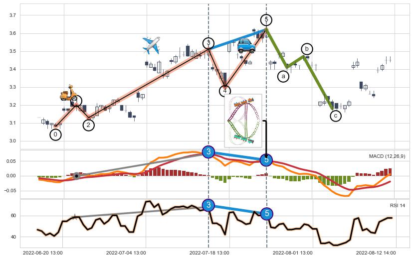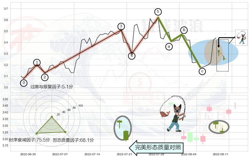 从2022-07-22 14:00至2022-08-03 14:00,共包含17个小时,阶段股价下跌-12.58%,阶段股价变动位移路程比: 1 : 1.6,2022-08-02 13:00向↘︎形成缺口,跳空下跌-5.85%˚