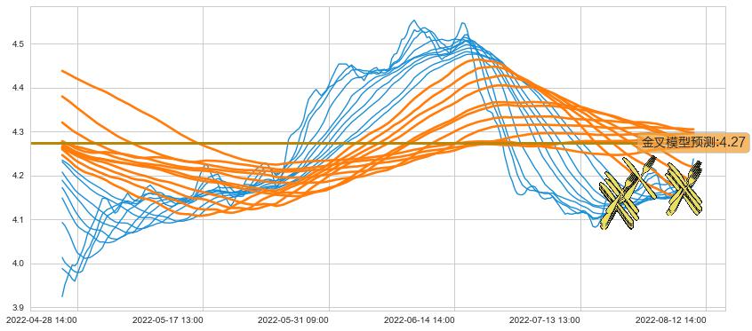 ➢ 80小时均线于(08-10 14:00: 4.17)形成【金叉】基于【金叉历史模型】预测金叉后最高波峰价格: 4.36, 金叉后最高价格4.31,尚未达到预测最高波峰价格, 预期继续上涨