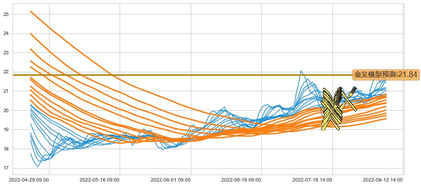 ➣ 80小时均线于(07-18 14:00: 20.03)形成【金叉】基于【金叉历史模型】预测金叉后最高波峰价格: 21.93, 金叉后最高价格22.19,虽然已经到达预测最高波峰价格,但耗时间很短动能很强, 预期继续上涨