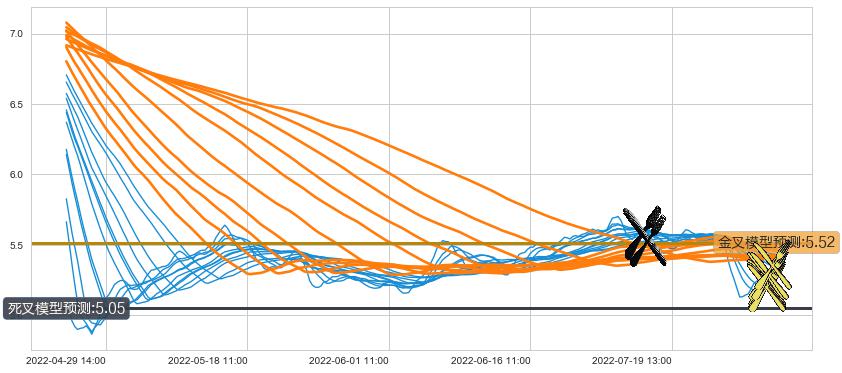 ➣ 60小时均线于(07-12 14:00: 5.52)形成【死叉】基于【死叉历史模型】预测死叉后最低波谷价格: 4.98, 死叉后最低价格5.10,尚未达到预测最低波谷价格, 预期继续下跌