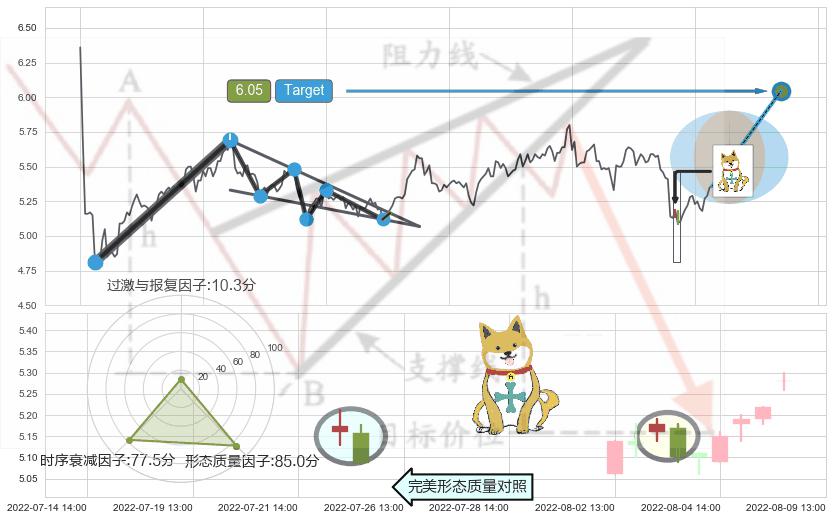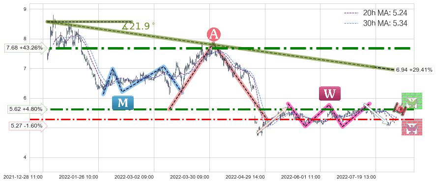 ♘ 阻力价格位5.62,可信任强度73.51%,距离最后交易2022-08-12 14:00形成的收盘价格5.36相差 +4.80%