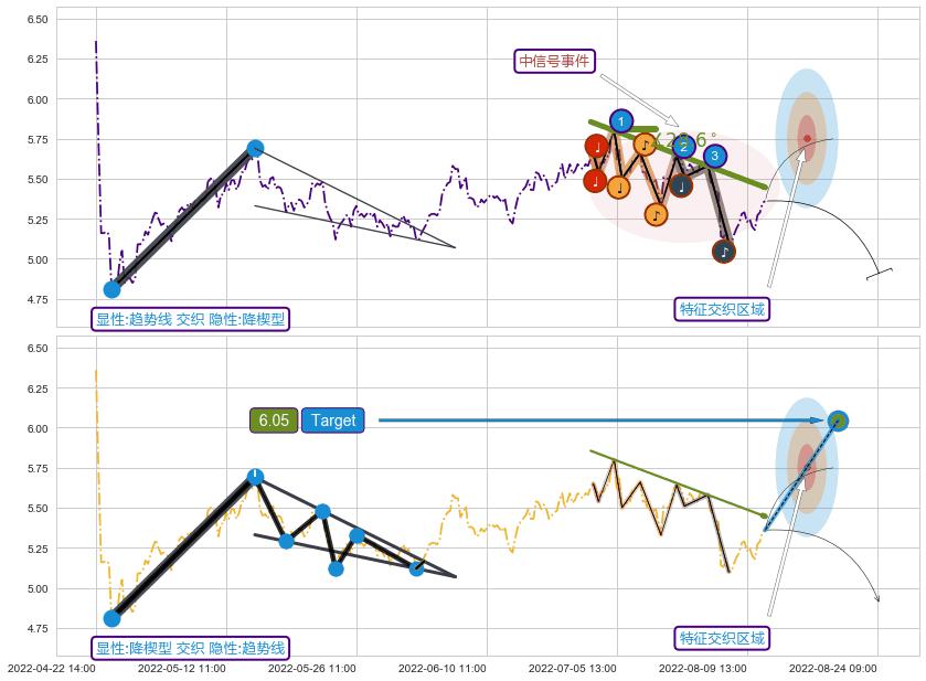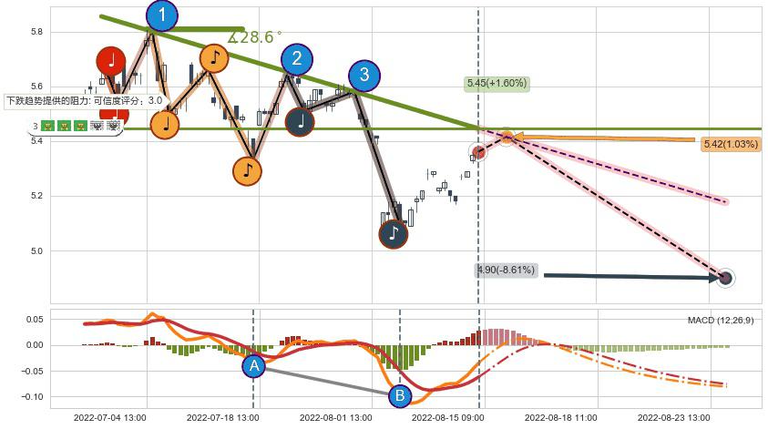 ♘ 在最后的下跌阶段2022-06-28 13:00至2022-08-12 13:00,存在 持续未破位的阻力位 ,阻力价格5.45,可信任强度74.44%,其距离最后价格5.36相差 +1.60%