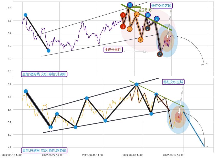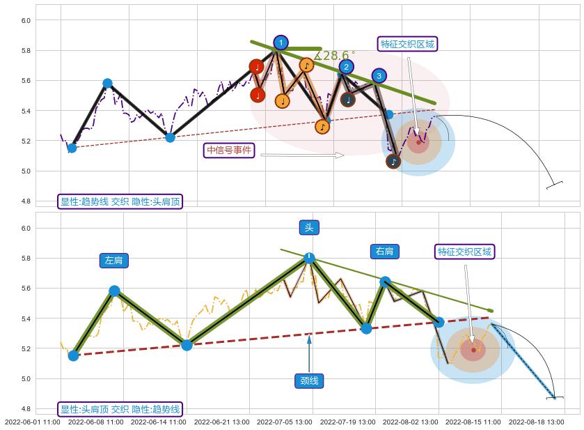 从2022-06-28 13:00至2022-08-12 13:00,共包含67个小时,阶段股价下跌-4.57%,阶段股价变动位移路程比: 1 : 12,下跌趋势角度: 28.6,2022-08-02 13:00向↘︎形成缺口,跳空下跌-4.99%˚