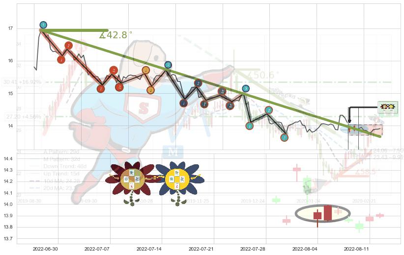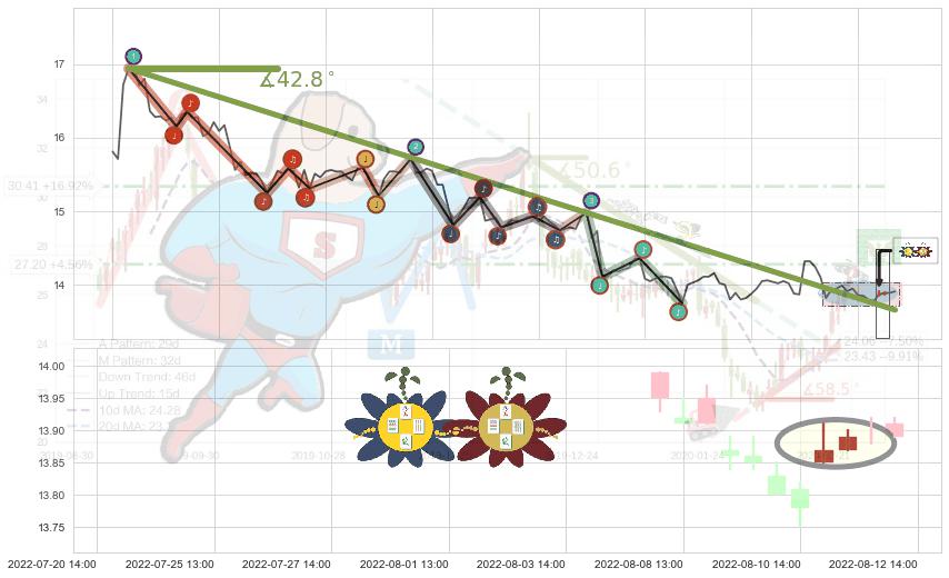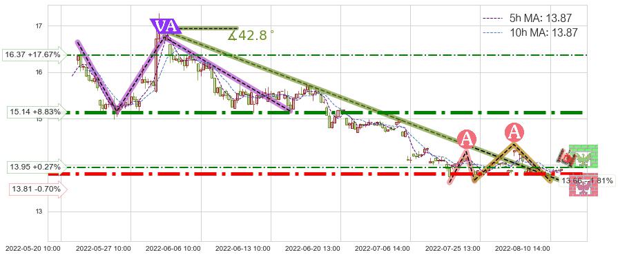 ➣ 2022-05-31 10:00-2022-07-20 13:00下跌趋势存在反转上涨[机会],虽然原下跌趋势的阻力位(13.66)已被突破,但其阻力效果尚存,原下跌趋势角度: 42.8˚
