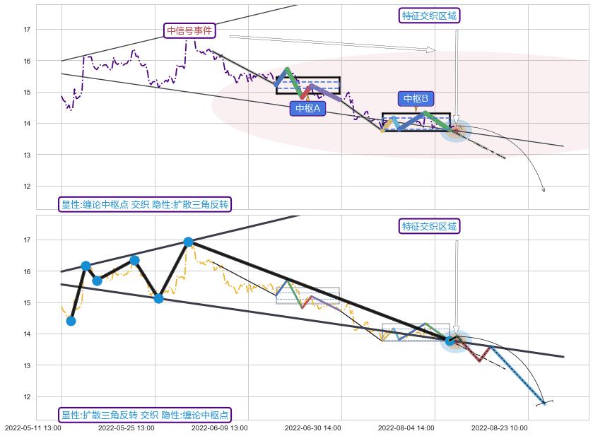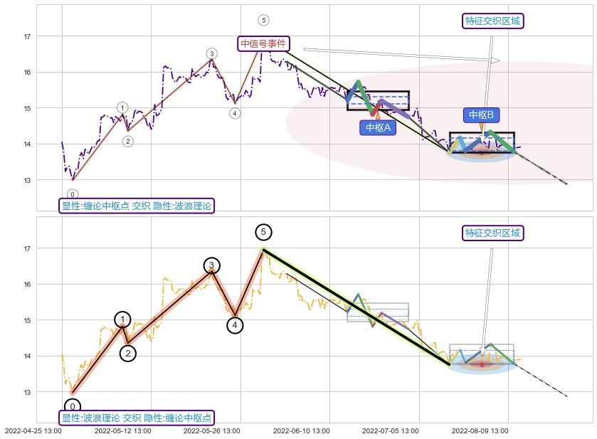 ➣ 【中枢B】:07-15:14-08-10:14,中枢由5笔构成,共37交易小时, ZG=14.16, ZD=13.80