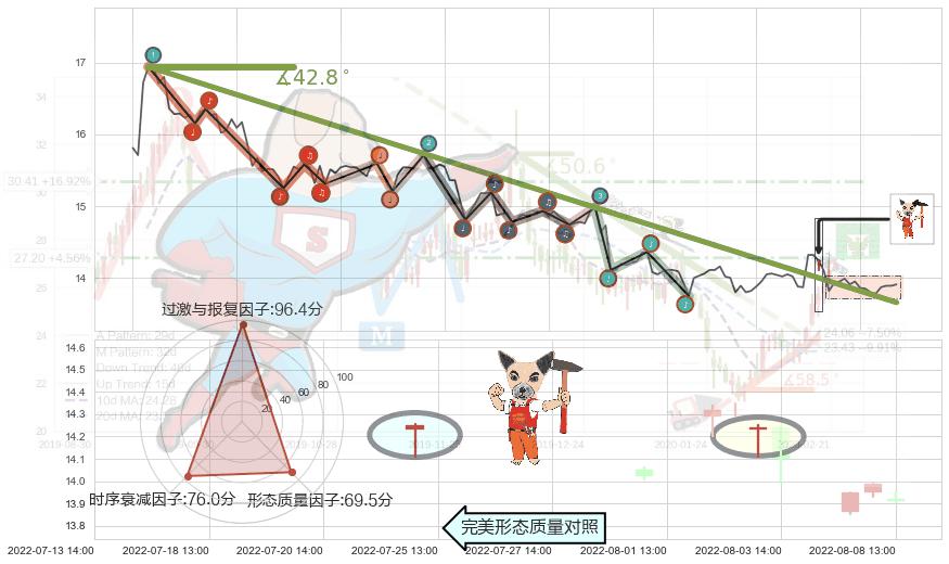从2022-05-31 10:00至2022-07-20 13:00,共包含110个小时,阶段股价下跌-17.78%,阶段股价变动位移路程比: 1 : 4,下跌趋势角度: 42.8