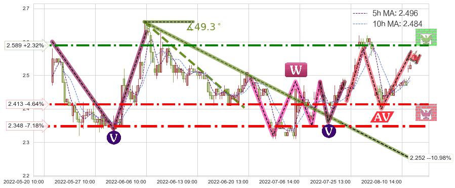 ♘ 阻力价格位2.589,可信任强度71.87%,距离最后交易2022-08-12 14:00形成的收盘价格2.530相差 +2.32%