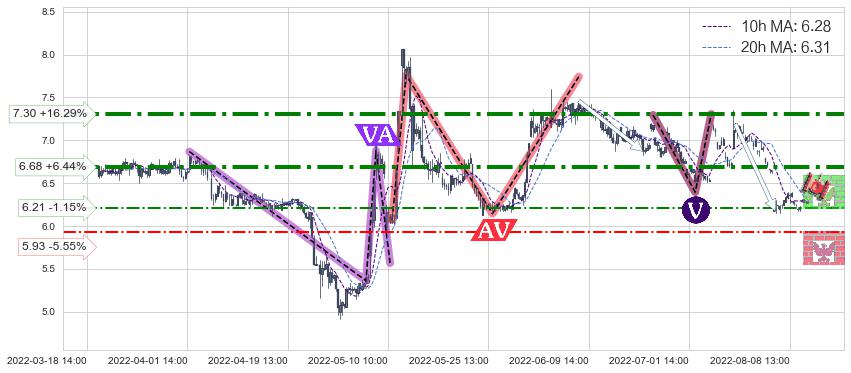 ♘ 阻力价格位6.68,可信任强度82.65%,距离最后交易2022-08-12 14:00形成的收盘价格6.28相差 +6.44%