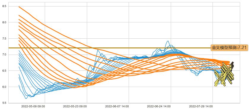 ➣ 70小时均线于(08-11 14:00: 6.54)形成【金叉】基于【金叉历史模型】预测金叉后最高波峰价格: 7.44, 金叉后最高价格6.55,尚未达到预测最高波峰价格, 预期继续上涨