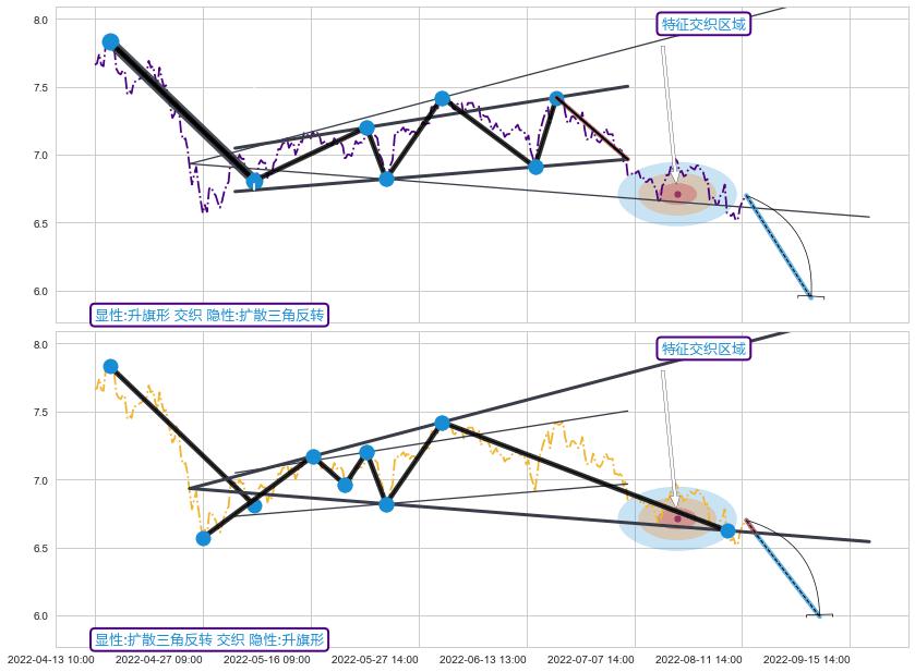 ➣ 扩散三角反转:下行突破支撑位破位, 猜想持续下沉下跌,被突破的支撑位已变为阻力位