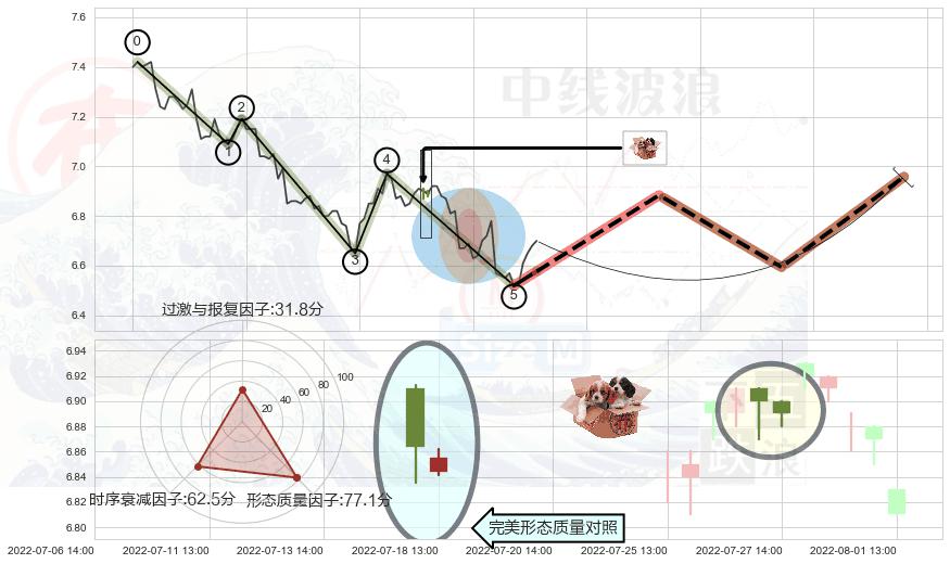 ➢ 🕰 价格走势在2022-07-14 13:00:00至2022-07-18 13:00:00期间形成高档五阴线,残存影响值:-2.42