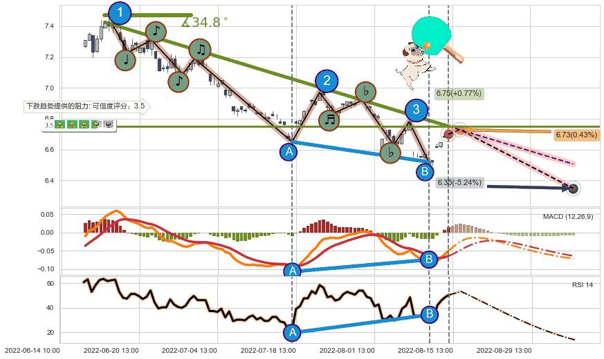 ➣ 预测:2022-09-05 14:00,【继续下探】稳定目前下跌趋势的前提下,预测价格:6.35