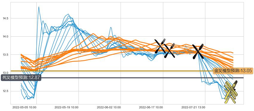➢ 55小时均线于(07-14 14:00: 13.59)形成【死叉】基于【死叉历史模型】预测死叉后最低波谷价格: 12.89, 死叉后最低价格12.18,已经下跌超出预测最低波谷价格, 预期反弹