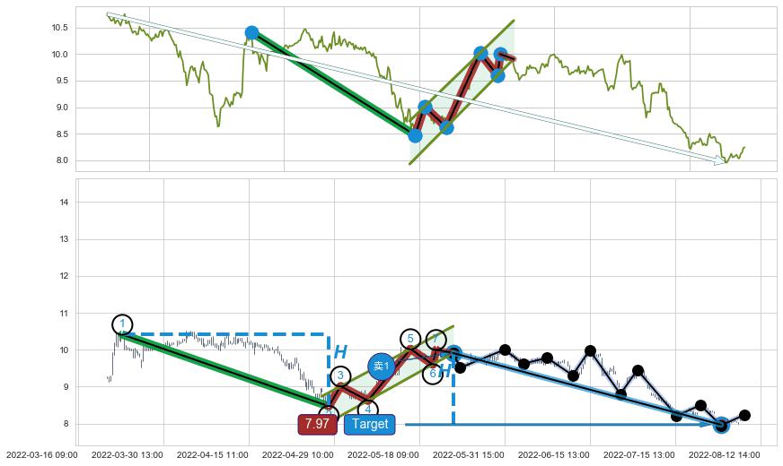 ➢ 升旗形:下跌目标target已达成:猜想强支撑位临近,预期反弹上涨(均值回复)