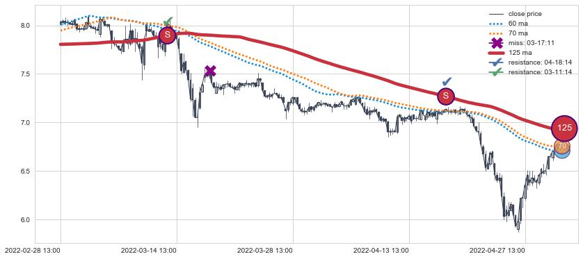 ➣ 70小时均线于(08-09 13:00: 7.25)形成【金叉】基于【金叉历史模型】预测金叉后最高波峰价格: 7.58, 金叉后最高价格7.71,已经上涨超出预测最高波峰价格, 预期回调