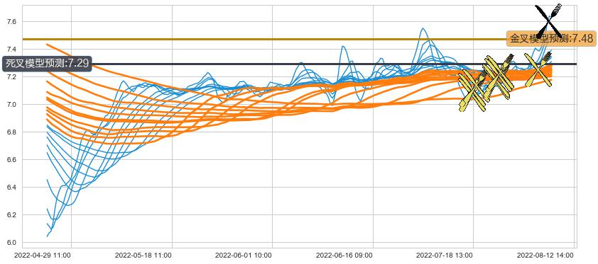 ➢ 5小时均线于(08-11 14:00: 7.60)形成【死叉】基于【死叉历史模型】预测死叉后最低波谷价格: 7.29, 死叉后最低价格7.58,尚未达到预测最低波谷价格, 预期继续下跌
