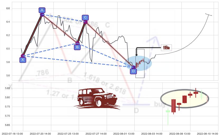 ➣ 谐波蝴蝶:c下跌到达d:猜想拉升 → 上涨 →【拐点】强支撑临近 → 大趋势均值回复