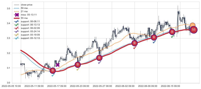 ➢ 最优均线组合共正确确认支撑阻力信号11处,正确确认率 55.00%