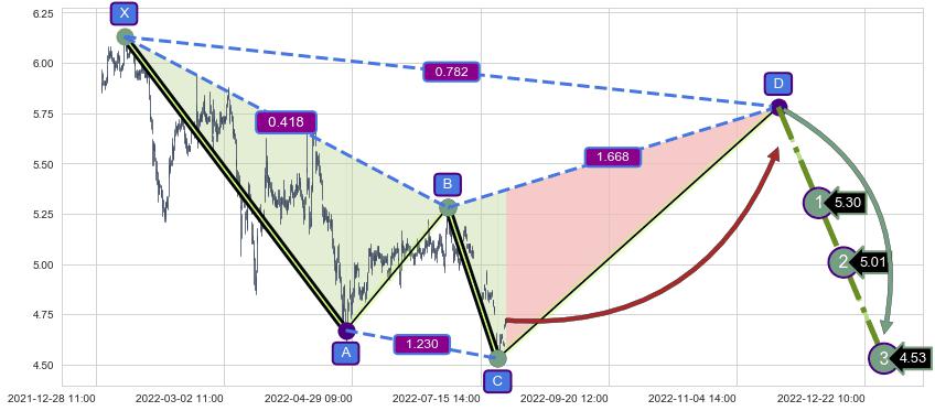 ➣ D点拟合预测价格5.78,距离最后交易收盘价格4.72相差 +22.48%