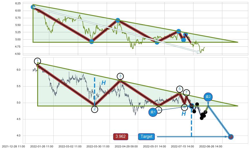 2022-06-22: 第一阻力位4.95有效抑制了下跌浪,成功阻止了价格的继续下跌。