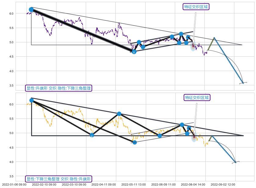 ➣ 下跌螺旋桨 + 下降三角整理支撑破位转换阻力下跌信号叠加后【目标达成率】低,【看空】信号叠加【存续影响大】