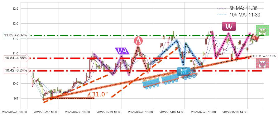 ♞ 5小时均线:11.36,10小时均线:11.30→ 快线>慢线