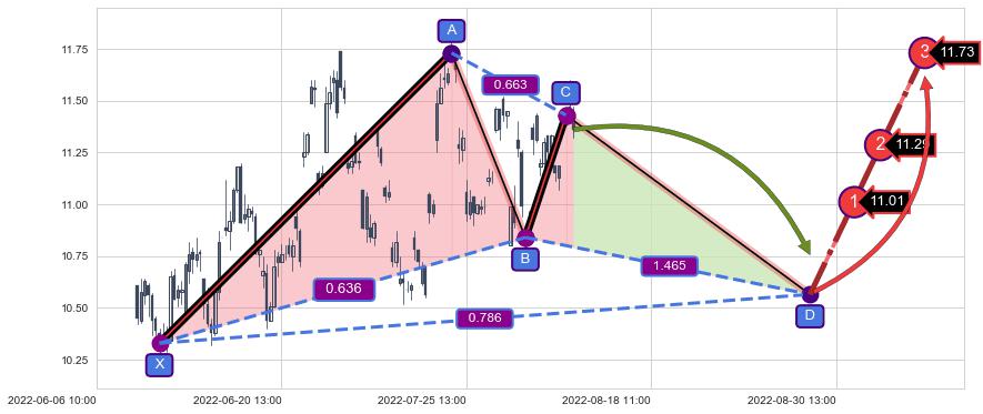 ➢ 距离预测D点位置有足够的下跌空间, 与看涨【伽利】形态相反,实际方向【看跌】
