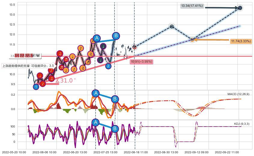♘ 支撑价格位10.42,可信任强度90.55%,距离最后交易2022-08-12 14:00形成的收盘价格11.36相差 -8.24%