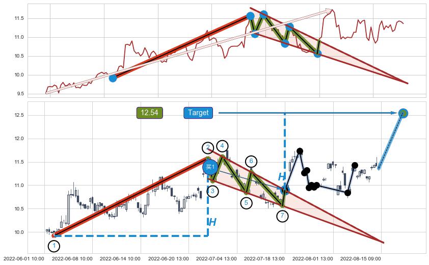 ➣ 降楔型:猜想预期上涨目标target即将达成,随后猜想强阻力来临,预期回调下跌(均值回复)