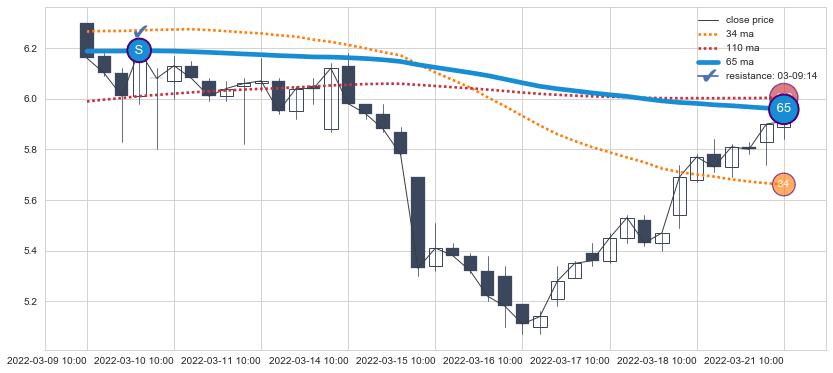 ➣ 34小时均线于(07-13 14:00: 5.78)形成【金叉】基于【金叉历史模型】预测金叉后最高波峰价格: 6.10, 金叉后最高价格6.52,已经上涨超出预测最高波峰价格, 预期回调