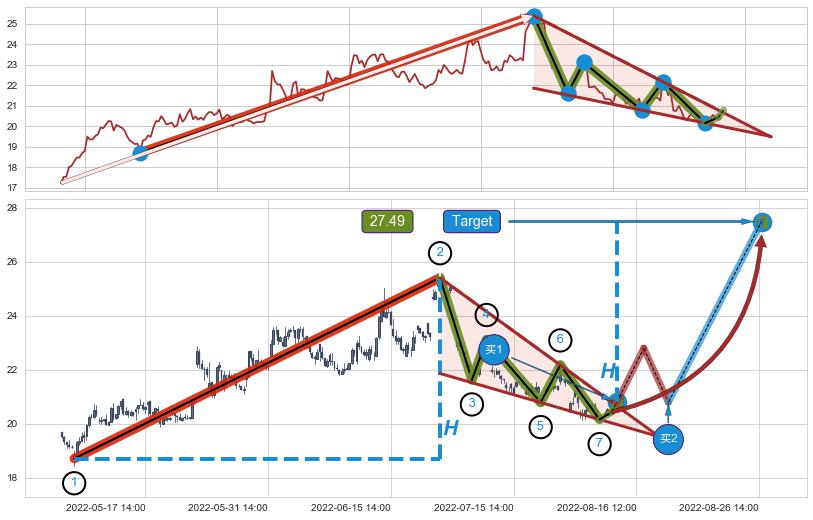 ➣ 降楔型:猜想临近关键阻力位突破点 → 临近拐点上涨 → 机会信号 → 大趋势均值回复