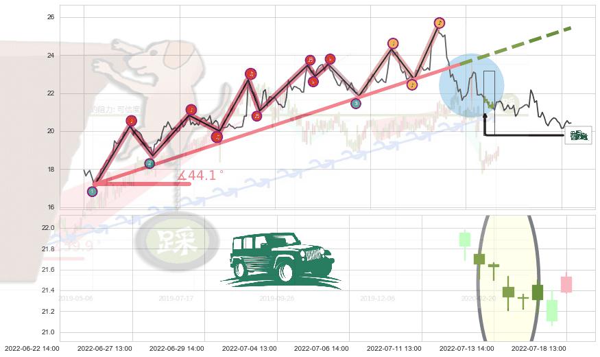 ➣ 2022-04-27 09:00-2022-07-04 14:00上升趋势存在反转[风险],其原上升趋势的支撑位(25.44)已破位[强阻力信号],原上升趋势角度: 44.1˚