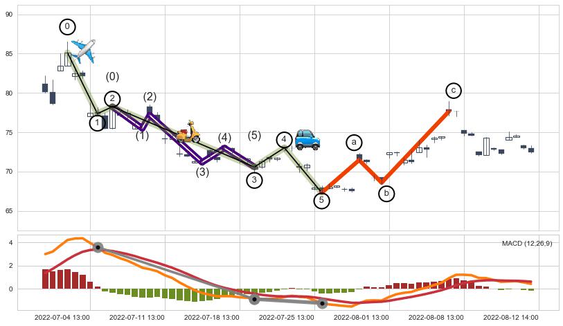 ➣ 波浪理论:猜想达到c点后小反弹终止反转下跌 → 下跌 → 【拐点】临近 → 阶段均值回复结束后继续大周期趋势跟踪