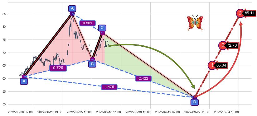 ➢ 距离预测D点位置有足够的下跌空间, 与看涨【蝴蝶】形态相反,实际方向【看跌】