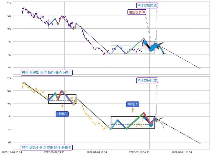 ➣ 缠论中枢点:猜想破位中枢B后持续下拉 → 下跌 → 破位中枢B支撑 → 持续趋势跟踪