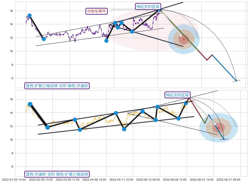 ➣ 扩散三角反转:猜想临近关键支撑位突破点 → 临近拐点下跌 → 风险信号 → 大趋势均值回复