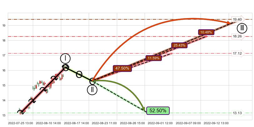 2022-07-11: 第一支撑位13.93强力阻拦了上升趋势,成功阻止了价格的继续上涨。
