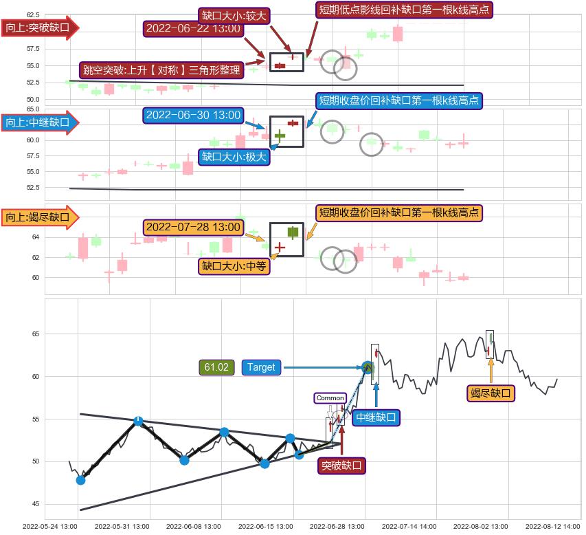 ➣ 突破缺口形成后,后续k已经超过14根,跳空突破上升【对称】三角形整理关键点后, 出现【中度回踩】迹象,短期收盘价回补缺口第二根k线低点