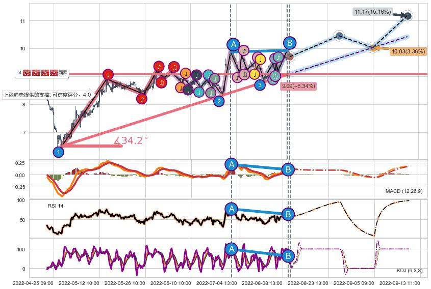 ♘ 在最后的上升阶段2022-04-27 09:00至2022-08-12 14:00存在 持续未破位的支撑位 ,支撑价格9.09,支撑可信任强度82.47%,其距离最后价格9.70相差 -6.34%