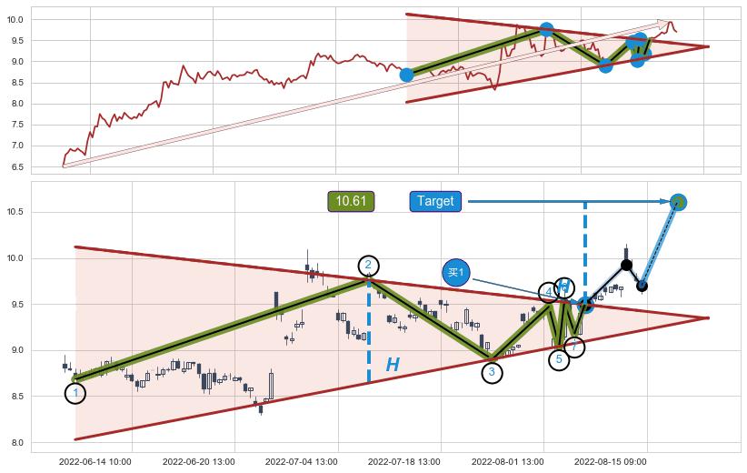 ➣ 缠论中枢点:猜想突破中枢B后持续拉升 → 上涨 → 突破中枢B阻力 → 持续趋势跟踪