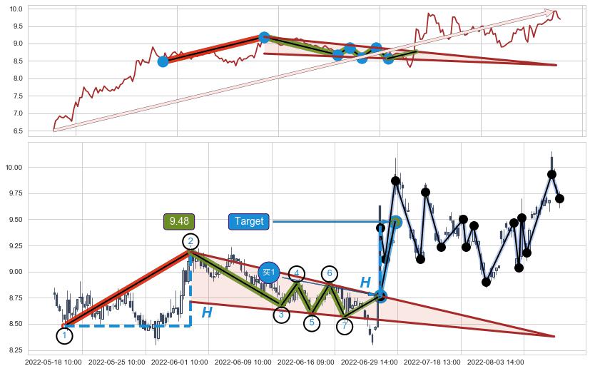➢ 【买1】: 激进型 买点 →(08-05:13: 9.49 )形成突破上升【对称】三角形整理【整理】形态
