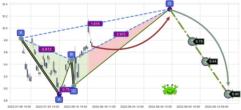 ➣ 谐波螃蟹:b下跌接近c:猜想支撑性拉升 → 上涨 →【拐点】支撑临近 → 大趋势均值回复