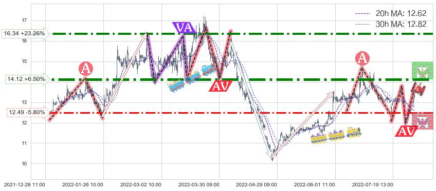 ♘ 阻力价格位14.12,可信任强度93.69%,距离最后交易2022-08-12 14:00形成的收盘价格13.26相差 +6.50%