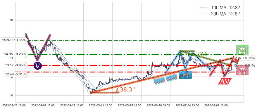 ♘ 阻力价格位14.35,可信任强度75.23%,距离最后交易2022-08-12 14:00形成的收盘价格13.26相差 +8.26%