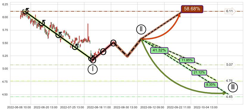 ➣ 预测:2022-09-01 10:00,【继续下探】稳定目前下跌趋势的前提下,预测价格:4.98