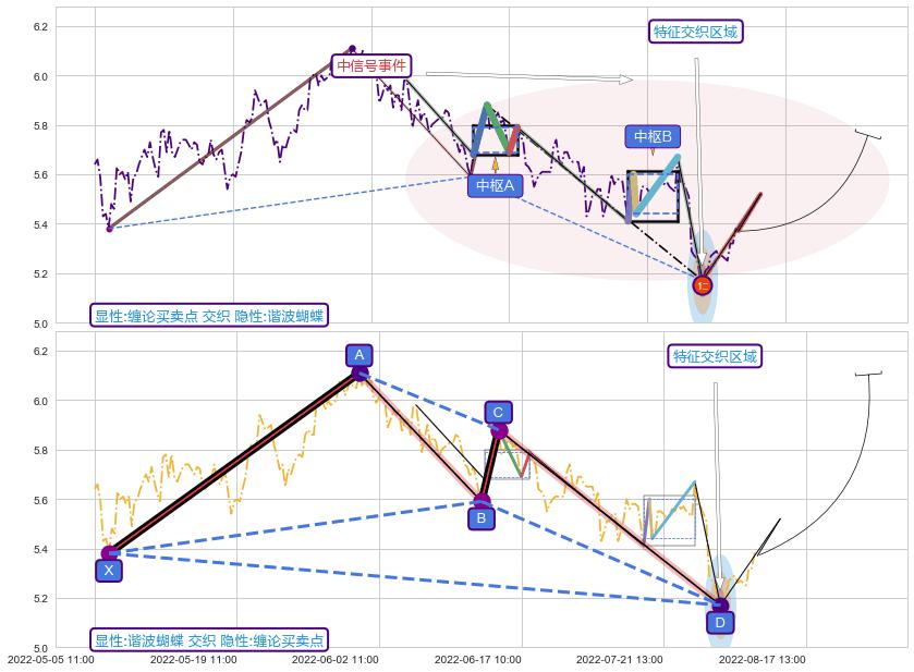 从2022-07-28 14:00至2022-08-12 14:00,共包含23个小时,阶段股价下跌-5.30%,阶段股价变动位移路程比: 1 : 2,2022-08-02 13:00向↘︎形成缺口,跳空下跌-3.99%˚