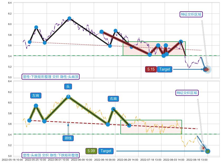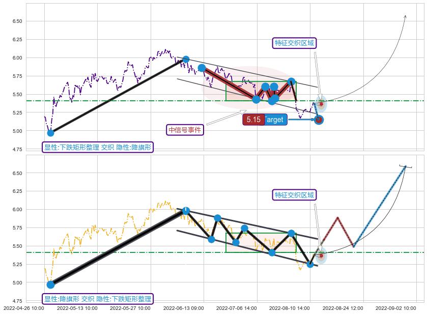 ♘ 在最后的下跌阶段2022-06-01 09:00至2022-08-11 14:00,存在 持续未破位的阻力位 ,阻力价格5.59,可信任强度83.36%,其距离最后价格5.37相差 +4.04%