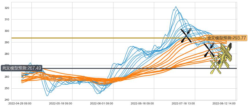 ➢ 45小时均线于(08-12 13:00: 282.10)形成【金叉】基于【金叉历史模型】预测金叉后最高波峰价格: 299.68, 金叉后最高价格283.27,尚未达到预测最高波峰价格, 预期继续上涨