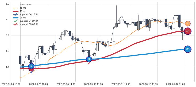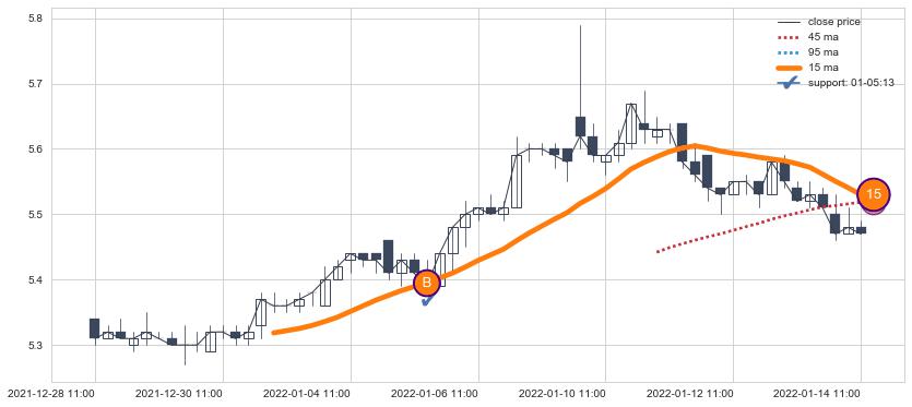 📝 多条均线形成死叉后走势最低价格达到: 5.25