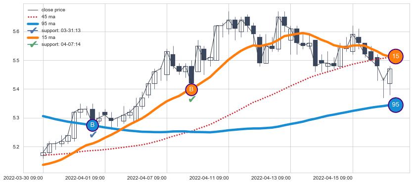 06-08 14:00至06-21 14:00 慢线与快线呈多头排列, 慢线与快线接触少,无缠绕